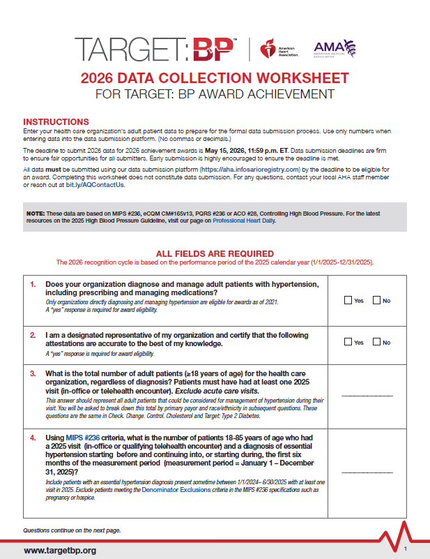 Use this worksheet to prepare your annual data submission for a Target: BP Achievement Award.