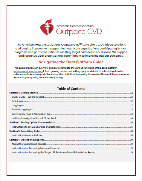 This guide provides an overview on how to navigate the various functions of the data platform (aha.infosarioregistry.com): from gaining access and setting up your details, to submitting data for achievement awards as part of our outpatient initiatives, to making the most of the available operational reports in your quality improvement journey.