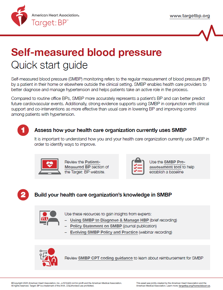Care teams can use this resource to quickly access information about self-measured blood pressure (SMBP) monitoring and the tools and resources available to help make impactful change.